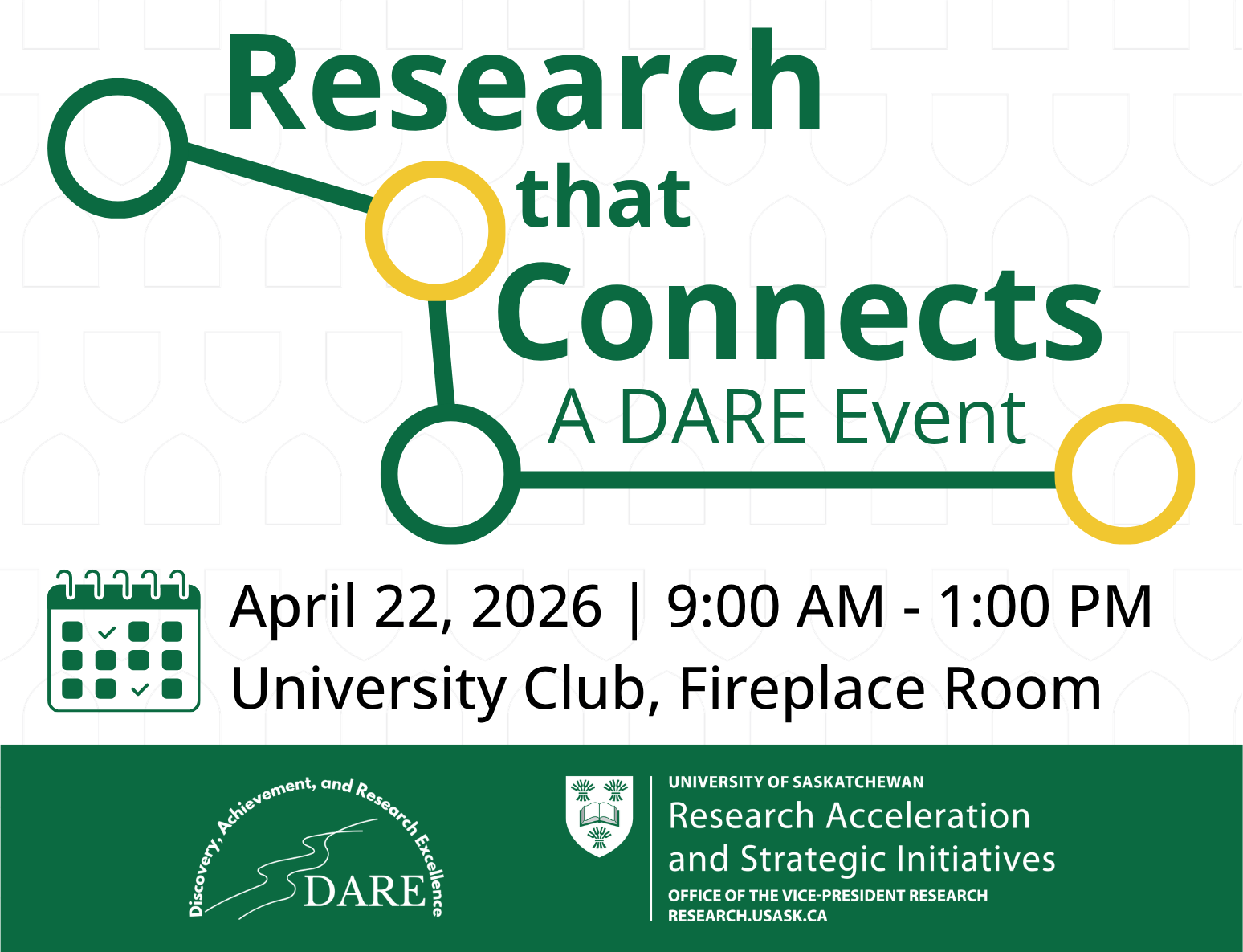 You are invited to attend Research that Connects: A DARE Event, hosted by the Office of the Vice-President Research. This is a special opportunity to meet with leaders in research engagement, promotion and partnership building.